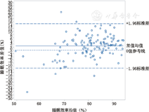 结果显示ICC值为0.69。采用Bland-Altman法分析,发现有3%(5/129例)的点在95%一致性界限以外,在临床上这种差异是可接受的。因此,MSMSMS和PSG在睡眠效率的判断上,两种监测方法具有较好的一致性(图1)。