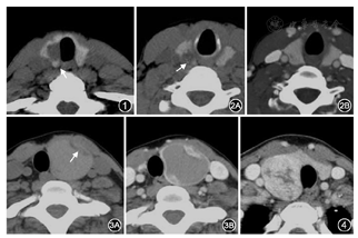 乳头状癌等MN和小滤泡为主的腺瘤样结节梗死及玻璃样变性等较少,增强后明显强化,与甲状腺间密度差降低,瘤体低密度区缩小/模糊,部分甚至高于甲状腺而呈高强化;结节性甲状腺肿富含纤维、梗死及玻璃样变性等,这些成分强化较低或不强化,与甲状腺间密度差增大,瘤体低密度区转清晰。本组增强后范围缩小/模糊更常见于MN中,OR值为5.729,高于形态不规则、咬饼征和微钙化,但其特异度较低(79.4%),提示该征象亦不宜单独应用。尽管高强化对BN的敏感度较低(19.0%),但特异度(97.4%)和OR值(10.782)均较高,说明高强化仍不失为诊断BN的重要征象。