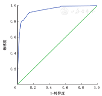 甲状腺BN多呈膨胀性生长,其边界多为规则的圆形、椭圆形或甲状腺塑形,而MN多呈浸润性生长,其边界多不规则,本组单因素和多因素分析均显示形态不规则更常见于MN中,比值比(OR)值为5.297,接近超声形态不规则OR低位值(2.7~37.788)[9,10],其诊断MN的敏感度(80.5%)和特异度(90.0%)均较高。咬饼征对甲状腺癌的诊断价值已得到部分学者的认可[2],其组织学基础为瘤体累及或接近甲状腺被膜,本组单因素和多因素分析均显示咬饼征更常见于MN中,OR值为3.467,与形态不规则比较,其诊断MN的敏感度(74.2%)虽较低,但特异度(94.3%)增高。