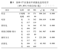 各种CT征象在甲状腺良恶性结节(BN、MN)中的分布(枚)
