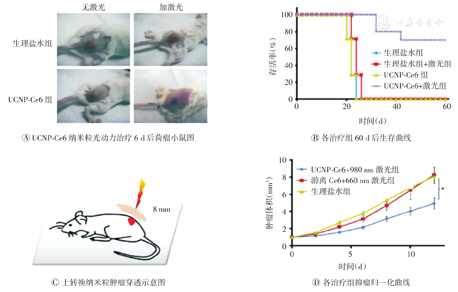 目前,经FDA批准的光敏剂大多适用于紫外或可见光激发,其穿透能力较差,只适用于浅表部位肿瘤的治疗。由于人体大部分组织能强烈吸收可见光,导致影响光敏剂发挥作用。有课题组[24]用两亲性PEG聚合物修饰上转化纳米粒(upconversion fluorescent nanoparticles, UCNs),将光敏剂二氢卟吩e6(Chlorin e6, Ce6)包载于聚合物疏水层,制备成UCNs-Ce6纳米复合体(图1)。体外实验结果表明,通过980 nm激发光激发后,UCNs-Ce6纳米复合体4T1细胞会产生强烈的抑制作用。体内实验结果表明,将UCNs-Ce6纳米复合体静脉注射到建立4T1乳腺癌模型的BALB/c小鼠体内,肿瘤生长可被抑制,小鼠存活时间延长。