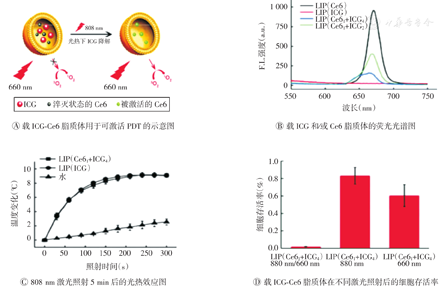 光敏纳米粒可使光敏剂富集于肿瘤部位,增强PDT效果。但大部分光敏纳米粒在体循环时会接受来自外界光的刺激而产生1Q2,对皮肤造成损伤。为克服光敏剂的光毒性,可激活光敏纳米粒成为目前研究的热点。有研究者研制出载有Ce6和吲哚菁绿(indocyaninegreen,ICG)的脂质体,其光敏剂分子之间通过相互作用,Ce6的光毒性可被ICG抑制(图2)[25]。当660 nm激光照射脂质体时,Ce6不能产生1Q2;当近红外808 nm激光照射时,ICG被分解,Ce6恢复产生1Q2。此外,ICG在近红外光照射下可将光能转化为热能而杀伤肿瘤细胞。