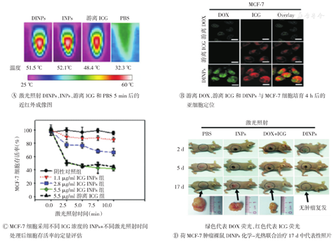 光动力疗法在临床上作为辅助疗法,可以与化疗协同治疗肿瘤。Zheng[55]将DOX和ICG共同包载于磷脂-聚合物纳米颗粒中(DINPs),成功构建了化疗光热协同的诊疗一体化纳米载药系统(图3)。其成功构建的DINPs可显著增强ICG的稳定性,在激光照射下能产生比游离ICG更高的局部温度,从而促进细胞对DOX和ICG的摄取。证明DINPs化疗与光热的协同治疗能抑制MCF-7肿瘤的生长,并高效防止肿瘤复发。
