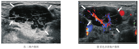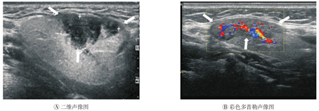 局限性结节样改变,共2例2灶(9.1%)。病侧腺体大小(长径×厚径)分别为2.4 cm×1.4 cm和3.6 cm×1.8 cm。病侧腺体内显示低回声区,大小分别为2.6 cm×0.8 cm和2.3 cm×0.9 cm;位于腺体的浅侧、被膜下,1例向外隆起;低回声区不均匀增粗(图2A),内见条状强回声,边界模糊,后方回声增强,内血流偏多(图2B),无明显占位效应。未累及区呈正常颌下腺超声表现。