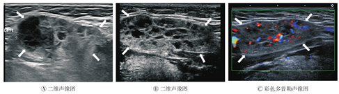 弥漫性结节样改变,共11例12灶(54.5%)。病侧腺体长径约2.7~4.6 cm,平均(3.7±0.56)cm,厚径约0.7~2.5 cm,平均(1.9±0.49)cm。8灶病侧腺体局部隆起,4灶病侧腺体形态无明显变化;均与周围组织分界清楚。颌下腺内部呈网格状或蜂窝状,未显示正常腺体回声。具体表现为腺体回声增强、增粗、不均匀,内见弥漫、散在、大小不一的结节样低回声区,低回声周围显示条状强回声(图3A、图3B),整个腺体血流丰富(图3C)。病变以腺体的边缘、浅侧为著。