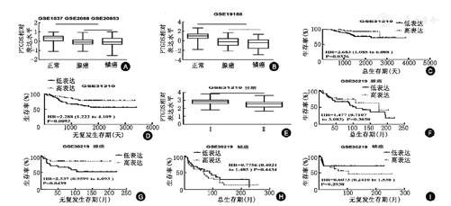 注:A, ID:31098,正常与ADC:P<0.001,正常与SCC:P<0.001, ADC a与SCC:P>0.05; B, ID:211663_x_at,正常与ADC:P<0.001,正常与SCC:P<0.001, ADC与SCC:P>0.05; C, ID:211663_x_at, HR=2.683 (1.085 to 6.008),P<0.05; D, ID:211663_x_at,HR=2.288 (1.222 to 4.109),P<0.001; E, ID:211663_x_at,P<0.001; F, ID:211663_x_at, HR=1.477 (0.710 7 to 3.083),P>0.05; G, ID:211663_x_at, HR=2.537 (0.959 9 to 6.093),P<0.05; H, ID:211663_x_at, HR=0.7756 (0.402 1 to 1.485),P>0.05; I, ID:211663_x_at, HR=0.6073 (0.241 0 to 1.530),P>0.05