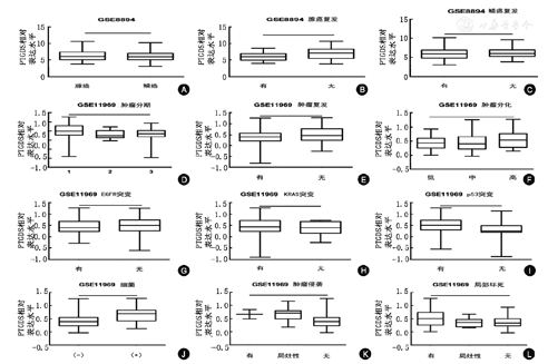GSE8894的分析结果显示,PTGDS蛋白表达,在ADC与SCC之间差异无统计学意义。此外,PTGDS与ADC的复发显著相关,与SCC的复发无明显相关性。GSE11969的分析结果显示,PTGDS的蛋白表达与ADC的临床分期、肿瘤复发以及分化程度均相关。这与p53基因突变有关,而与EGFR、KRAS的基因突变无关。此外,PTGDS蛋白表达还受到局部因素,诸如细菌、肿瘤侵袭以及组织坏死等的影响(图2)。