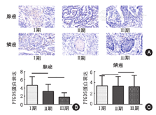 首先,对正常组织与肿瘤组织中的PTGDS蛋白表达进行对比,结果显示PTGDS在肿瘤组织中是表达下调的,见图3,t=7.300,df=93,P<0.001。然后,对ADC与SCC组织中的PTGDS蛋白表达进行对比,结果显示两者之间无明显差异,见图3,t=0.4868,df=83,P=0.628。其次,对ADC不同临床分期中的PTGDS蛋白表达进行对比,结果显示PTGDS在高临床分期中的蛋白表达要明显低于在低临床分期中,见图4,Ⅰ期与Ⅱ期:t=2.199,df=33,P=0.035;Ⅱ期与Ⅲ期:t=2.374,df=23,P=0.026。最后,对SCC不同临床分期中的PTGDS蛋白表达进行对比,没有发现明显差异,见图4,Ⅰ期与Ⅱ期:t=0.057,df=25,P=0.955;Ⅱ期与Ⅲ期:t=0.106,df=17,P=0.917。