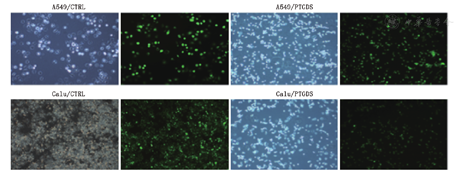 在质粒中克隆PTGDS的cDNA,这些扩增的cDNA用于在A549和Calu-3细胞中过表达PTGDS蛋白。被转染含有cDNA的质粒的细胞被命名为A549/PTGDS和Calu-3/PTGDS,被转染不含有cDNA的质粒的细胞被命名为A549/CTRL和Calu-3/CTRL。在细胞转染72 h以后,用1.5 ng/ml的嘌呤霉素对细胞进行选取。