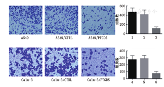 PTGDS在ADC和SCC中的蛋白表达均下调,但是在ADC和SCC之间差异无统计学意义,且其仅与ADC的肿瘤发展相关。在过表达PTGDS以后,ADC肿瘤细胞的侵袭能力显著下降,蛋白质印迹法显示其内部机制可能与MAPK信号通路有关。