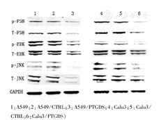 转染质粒后,得到稳定生长的A549和Calu-3细胞(图5)。在过表达PTGDS以后,A549和Calu-3细胞的侵袭能力显著下降(图6)。蛋白质印迹实验显示,随着PTGDS蛋白表达的升高,MAPK信号通路相关蛋白,诸如p-P38、T-P38、p-ERK、T-ERK、p-JNK以及T-JNK的蛋白表达显著下降(图7)。