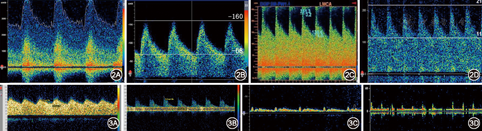 将4或8 MHz探头置于桡动脉搏动处,可检测到桡动脉。血流频谱形态为外周动脉频谱,收缩峰高尖,舒张期早期血流反向。