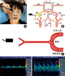 嘱患者闭眼,探头置于眼睑上,偏向内侧。检测血管:如图,眼窗用于检查OA和CS。当颞窗穿透不良时,可通过眼窗探测到对侧ACA、MCA、PCA[12]。
