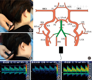 在具备彩色多普勒超声(简称彩超)设备的情况下,可以先进行颈动脉彩超检查,再进行TCD检查;如果没有颈动脉彩超,则可使用TCD对颈部动脉进行检查[1],可采用4 MHz连续波探头或者2 MHz脉冲波探头。