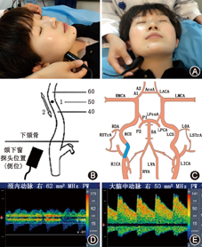 检测步骤:①将探头放在下颌侧下方、胸锁乳突肌前中部。探头向上并略偏向中线。设定深度为50 mm。寻找背离探头方向的低阻力血流信号。②深度从50 mm增加至60 mm再降低至40 mm。在显示最高血流速度信号的深度记录ICA入颅前段血流信号。