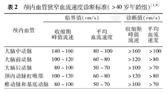 目前,国际上关于颅内动脉狭窄的诊断标准以及狭窄程度的诊断标准不统一[7,10,12,13]。大多数研究对狭窄的判断主要是根据血流速度,一些研究开始包括其他的指标,比如狭窄段与狭窄近段流速的比值、狭窄段与狭窄远段流速的比值、双侧同名动脉血流速度的不对称性等指标。对于颅内动脉狭窄的血流速度诊断值见表2[1,8]。