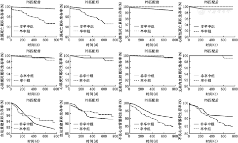 ±s或中位数(四分位数),计数资料以比例(%)表示。计量资料采用配对t检验,计数资料采用χ2检验。多因素回归分析采用Logistic回归分析。生存曲线采用Kaplan-Meier生存分析,不良事件的多因素回归分析采用COX回归分析。倾向性得分匹配(PS)采用R语言的Rstudio软件进行。P<0.05为差异有统计学意义。