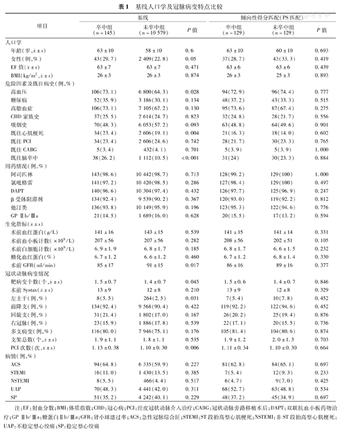 注:EF:射血分数;BMI:体质指数;CHD:冠心病;PCI:经皮冠状动脉介入治疗;CABG:冠状动脉旁路移植术后;DAPT:双联抗血小板药物治疗;GP Ⅱb/Ⅲa:糖蛋白Ⅱb/Ⅲa;GFR:肾小球滤过率;ACS:急性冠脉综合征;STEMI:ST段抬高型心肌梗死;NSTEMI:非ST段抬高型心肌梗死;UAP:不稳定型心绞痛;SP:稳定型心绞痛