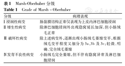 尽管CD的病理改变是非特异性的,但病理学仍是CD确诊的金标准。过去仅有典型小肠绒毛改变的患者才被诊断为CD,近年人们对CD组织病理学变化的认识有所改变,Mulder等[39,40]研究认为CD小肠绒毛的改变是一个进行性的过程并可表现为多种形式,并建立了相关的分级标准,目前多应用Marsh-Oberhuber分级(表1)。越来越多的临床研究表明,虽然Ⅲ期病理改变是CD的典型病理改变,但CD患者小肠绒毛也可出现Ⅰ、Ⅱ期的病理改变,甚至有研究显示血清抗体阳性但组织学正常的患者也可能为潜伏和隐藏的CD患者[41]。因此,目前指南提出对于疑似CD患儿血清学检查阳性同时病理表现符合Marsh Ⅱ~Ⅲ级可明确诊断,若病理正常或符合Marsh Ⅰ级表现建议进一步完善其他检测;针对CD患儿的病理活检建议十二指肠球部留取1、2块病理组织,十二指肠远端应不少于4块病理组织[9]。