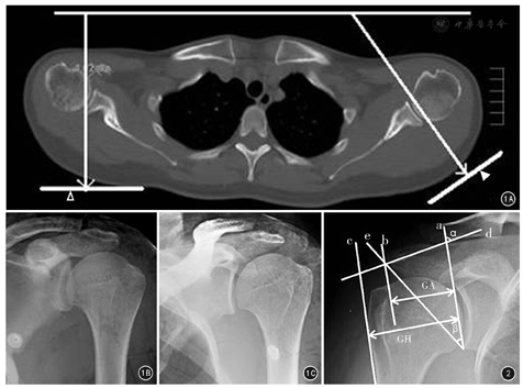 以往有研究认为,肩袖撕裂的发生与肩峰形态的变异密切相关[1,2,3,4,5]。1972年,Neer通过尸体研究首次提出肱骨头与肩峰前方骨皮质之间存在肩峰下撞击,并认为在肩峰下撞击的发生过程中,肩峰外侧缘并没有起到作用,撞击主要是发生在前部肩峰下骨皮质[6]。但是,2006年Nyffeler等[7]重新分析了肩峰外侧方骨皮质形态变异与肩袖撕裂之间的关系,并且创造性地用肩峰指数来反映这种变异,结果显示在肩袖全层撕裂患者中平均肩峰指数为0.73±0.06,在盂肱关节炎患者中为0.60±0.08,在健康人群中为0.64±0.06;并认为,肩峰向外侧的延展度过大是导致肩袖撕裂的病因,而延展度过小则会导致盂肱关节炎的发生。Banas等[8]测量了肩峰下方骨皮质与肩胛盂之间的夹角,将其命名为肩峰侧倾角,其研究结果显示在肩袖全层撕裂患者中平均肩峰侧倾角<70°,在健康人群中平均为80°。2013年,Moor等[9]认为肩胛盂倾斜角度的变异同样是此类疾病的致病因素,并由此提出决定性肩角这一概念,其研究结果为在肩袖全层撕裂患者中平均决定性肩角为38.0°(29.5°~43.5°),在盂肱关节炎患者中为28.1°(18.6°~35.8°),在健康人群中为33.1°(26.8°~38.6°),并且认为决定性肩角在临床应用中效果优于肩峰指数。2014年,Moor等[10]比较了肩峰指数、肩峰侧倾角和决定性肩角在诊断肩袖撕裂时的效能,并认为决定性肩角是诊断肩袖撕裂最有效的指标。但是,Moor等[10]研究设计没有同时使用三种参数对同一患者进行应用,探讨对肩袖撕裂诊断更有效的参数。