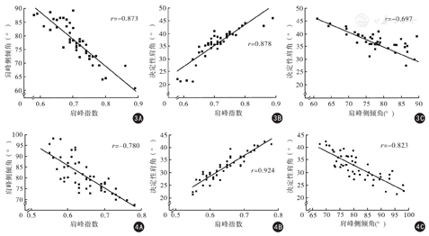 肩袖撕裂患者的平均肩峰指数为0.71±0.06、平均肩峰侧倾角为78.1°±6.89°、平均决定性肩角为35.9°±5.7°,健康志愿者的平均肩峰指数为0.65±0.06、平均肩峰侧倾角为81.1°±7.74°、平均决定性肩角为32.3°±5.18°,两组差异均有统计学意义(t=4.867、-1.994、3.225,P值均<0.05)。相关性分析显示,肩袖撕裂组和健康对照组研究对象肩峰指数与肩峰侧倾角呈负相关,而与决定性肩角呈正相关(r=-0.873、-0.780, r=0.878、0.924, P值均<0.01)。