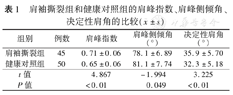 肩袖撕裂组和健康对照组的肩峰指数、肩峰侧倾角、决定性肩角的比较(