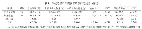 | 组别 | 例数 | 分娩孕周(周)a | 大胎儿出生体重(g)a | 小胎儿出生体重(g)a | 宫内治疗b | 死胎b | 孕母合并症c | IVFc |