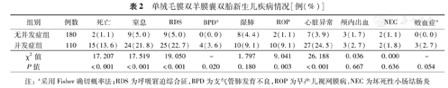 注:a采用Fisher确切概率法;RDS为呼吸窘迫综合征,BPD为支气管肺发育不良,ROP为早产儿视网膜病,NEC为坏死性小肠结肠炎