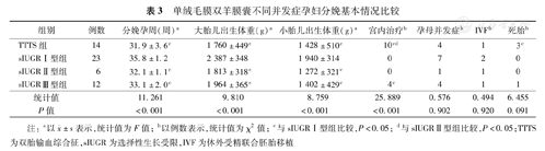 MCDA合并TTTS孕妇14例,占9.7%;合并sIUGR孕妇41例,其中Ⅰ型23例,占15.9%,Ⅱ型炎6例,占4.1%,Ⅲ型12例,占8.3%。合并sIUGRⅡ型、Ⅲ型及TTTS孕妇分娩孕周和新生儿出生体重均小于sIUGRⅠ型,差异有统计学意义(P<0.05);TTTS、sIUGRⅡ型和 Ⅲ型之间差异无统计学意义(P>0.05)。合并TTTS孕妇发生新生儿死亡7例,死胎3例,3例死胎均为受血者死亡;合并sIUGRⅠ型无新生儿死亡及死胎发生;合并sIUGRⅡ型新生儿死亡1例,为体重小的胎儿;合并sIUGRⅢ型新生儿死亡2例,死胎2例,死亡新生儿胎龄分别为31+5周和32+2周,均为小胎儿出生时重度窒息死亡,死胎2例为31+4周双胎;合并TTTS死胎发生率高于sIUGRⅠ型,差异有统计学意义(P<0.05)。合并TTTS和sIUGRⅢ型孕妇分别有10例和4例接受宫内治疗,sIUGRⅠ型和sIUGRⅡ型没有产妇接受宫内治疗。各组母亲孕期并发症和是否IVF差异无统计学意义(P>0.05)。见表3。