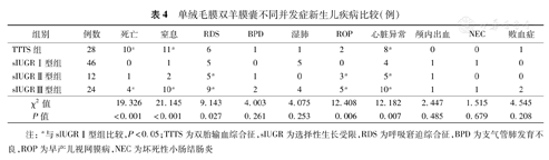 MCDA合并sIUGRⅡ型新生儿RDS、ROP、心脏异常发生率高于sIUGRⅠ型,合并sIUGRⅢ型新生儿死亡、RDS、湿肺、窒息、ROP、心脏异常发生率高于sIUGRⅠ型,合并TTTS新生儿死亡、窒息、心脏异常发生率高于sIUGRⅡ型,差异均有统计学意义(P<0.05)。见表4。