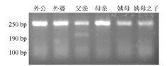 对家系成员PCR-RFLP结果:包括对外公、外婆、母亲、母亲姐姐(姨母)、姨母之子提取DNA,进行PCR-RFLP检测,均未见被酶切的条带,无PAX4外显子5上R192H变异。而血糖水平正常的父亲,被限制性内切酶切开成为三条条带,考虑父亲存在PAX4基因外显子5 R192H变异,且为杂合子,PCR-RFLP结果见图2。