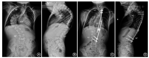 注:术前脊柱全长正侧位X线片(A,B):主胸弯Cobb角108°,上胸弯66°,腰弯38°,胸椎后凸75°,腰椎前凸57°。单侧生长棒固定术后脊柱全长正侧位X线片(C,D):主胸弯Cobb角45°,上胸弯42°,腰弯15°,胸椎后凸42,腰椎前凸30°