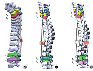 当然,有限元分析这种研究方式本身存在一些局限性。首先,因无法获得脊柱各部件的真实应力值,故在有限元研究中只能参考文献数据对各结构应力进行赋值。其次,有限元模型的几何形状仅仅代表患者术前和术后短期情况,不能对其进行动态随访观察。第三,与所有脊柱有限元模型一样,模型经过简化处理:椎间盘被假设为八面体,并未囊括所有韧带,模拟的椎弓根钉或椎板钩位置发生微小的变化将造成不同曲度的生长棒结构,影响分析的准确性。总体来说,本研究结果仅代表一种应力趋势而非精确评价。