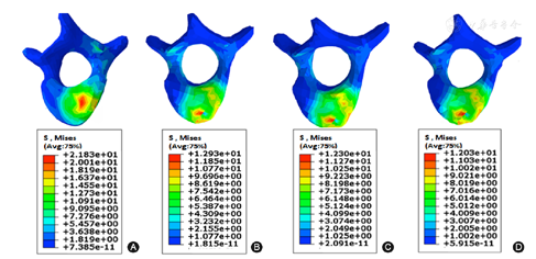 注:A:模型1应力情况;B:模型2应力情况;C:模型5应力情况;D:模型6应力情况(椎体中不同颜色代表相应区域应力的大小,下方颜色条带用科学记数法说明不同颜色对应的应力值大小,红色代表应力最大,向下依次减小,深蓝色代表最小值)