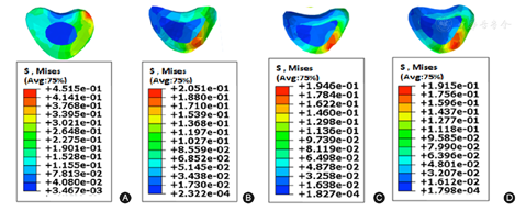 注:A:模型1应力情况;B:模型2应力情况;C:模型5应力情况;D:模型6应力情况(椎间盘中不同颜色代表相应区域应力的大小,下方颜色条带用科学记数法说明不同颜色对应的应力值大小,红色代表应力最大,向下依次减小,深蓝色代表最小值)