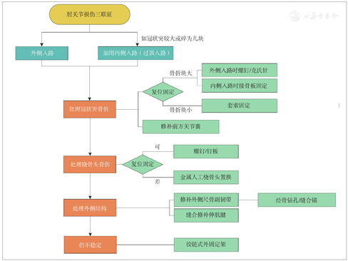 肘关节损伤三联征的手术治疗通常参考下面的流程图选择各损伤部位的治疗方法(图1)。