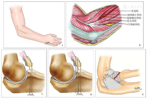 对伸肌腱较完整者,可采用偏前间隙入路,但应注意需通过后方间隙(Kocher)修复撕裂的外侧尺骨副韧带(lateral ulnar collateral ligament, LUCL)。