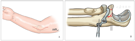 首先取内侧切口,从肱骨内上髁上方3~5 cm处向腕部中点方向延长,超过冠状突约5~7 cm,切口长约8~12 cm(图3A)。仔细分离和保护前臂内侧皮神经;近端沿上臂内侧肌间隔切开深筋膜。