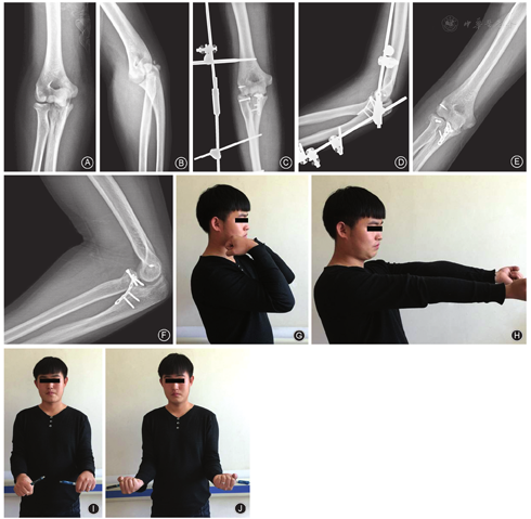 术后处理原则:①尽早功能锻炼。使用铰链式外固定支架的患者,在术后第2天即开始行全范围功能锻炼,包括肘关节屈伸和前臂旋转练习,可进行主动锻炼和轻柔的被动锻炼,禁止他人暴力地被动按摩和牵拉。石膏制动者,术后7~10 d拆除石膏后开始锻炼,6周内避免肘关节承受内翻应力,在不锻炼时可使用支具保护,术后1个月内限制伸肘超过30°。②预防异位骨化。早期主动活动,以抑制骨化的发生。