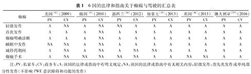 6国的法律和指南关于癫痫与驾驶的汇总表