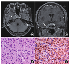 肿瘤是本组海绵窦区病变第二位病因,其中以脑膜瘤最常见。本组患者三叉神经第二支受累多见,与其他组比较差异有统计学意义(χ2=5.213,P=0.022,表3)。本组肿瘤患者中,有4例(9.3%)早期诊断为THS接受激素或其他免疫治疗,随访时确诊为肿瘤性疾病,包括淋巴瘤1例,腺性囊样癌1例,乳腺癌转移1例,肺癌转移1例。本组1例海绵窦原发性组织细胞肉瘤,为国内首例报道。患者女性,51岁,亚急性起病,头痛复视1个月,MRI示右海绵窦病变(图2),曾在外院诊为THS而接受激素治疗。手术病理证实为组织细胞肉瘤(图3,图4),术后半年死亡。