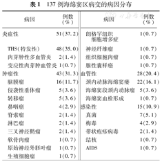 | 炎症性 | 51(37.2) | 朗格罕组织细胞增多症 | 1(0.7) | ||