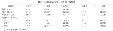 | 一般特征 | 炎症性 | 肿瘤性 | 血管性 | 感染性 | 合计 | |