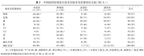 海绵窦区病变各组在起病年龄方面差异无统计学意义。血管性疾病组男性比例高于其他组,差异有统计学意义(χ2=5.976,P=0.009,表2)。炎症性疾病组急性起病比例高,与其他组相比,差异有统计学意义(χ2=8.753,P=0.003,表2),而肿瘤组多呈慢性病程,与其他组相比,差异有统计学意义(χ2=5.674,P=0.016,表2)。