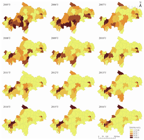 从2005-2016年三峡地区菌痢报告发病率动态地图中看出,2005年三峡地区菌痢疫情较重,高发地区主要集中在西南大部及南部部分地区,2006年高发地区蔓延至中部,到2007-2008年菌痢疫情有所减轻,中部及西南部分地区发病率降低,2009年之后三峡地区菌痢疫情范围明显缩小,疫情最严重地区位置相对稳定,主要是九龙坡区、沙坪坝区、南岸区、渝中区、长寿区和城口县(图2)。