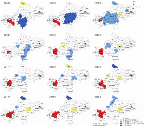 二类聚集区由大范围集中变为散在分布。2005年二类聚集区主要位于南部,次年转移至中部,到2007年蔓延至中部偏西南部且聚集性减弱,2008-2012年间聚集范围明显缩小,且聚集性相对较弱(LLR<100),从2013年开始,聚集县(区)不超过3个。