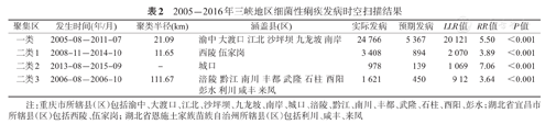 (2)单纯空间聚集性:对2005-2016年累计病例进行单纯空间扫描,得到1个一类聚集区和2个二类聚集区。一类聚集区位于重庆市主城区(包括渝中区、大渡口区、江北区、沙坪坝区、九龙坡区、南岸区、北碚区、渝北区和巴南区),此区域较其他区域高发(RR=5.18,P<0.001)。西陵区和伍家岗区构成1个二类聚集区,位于三峡地区东部,RR=3.38,P<0.001;城口县为另外1个二类聚集区,位于三峡地区北部(RR=2.18,P<0.001)。