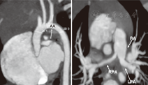 注:AA:主动脉弓部;PA:主肺动脉;RPA:右肺动脉;LPA:左肺动脉 AA:aortic arch;PA:pulmonary artery;RPA:right pulmonary artery;LPA:left pulmonary artery