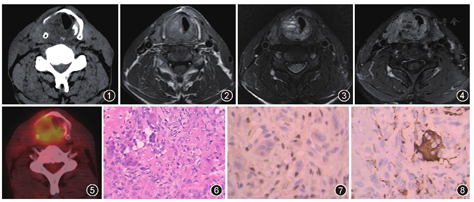 手术及病理:于甲状腺右侧叶及环状软骨板下缘声门下见右侧喉室外生型白色新生物,质硬,钳夹后有少量出血。肿块向前累及甲状腺右侧叶,向后累及气管-食管沟。病变破坏右侧声带并侵犯对侧声带及第1气管软骨环,浸润深度达喉壁深肌层。病理检查:见肿瘤内大量梭形单核细胞,其间散在分布多核巨细胞(图6)。免疫组织化学染色:波形蛋白、P63单核细胞(图7)、PGM-1多核细胞阳性(图8),CK、结蛋白、平滑肌肌动蛋白、CD34、S-100均为阴性,Ki-67 10%。结合组织形态及免疫组织化学诊断为喉侵袭性巨细胞瘤。