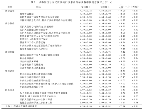 | 维度 | 指标 | 窗口挂号 | 预约挂号 | t值 | P值 |